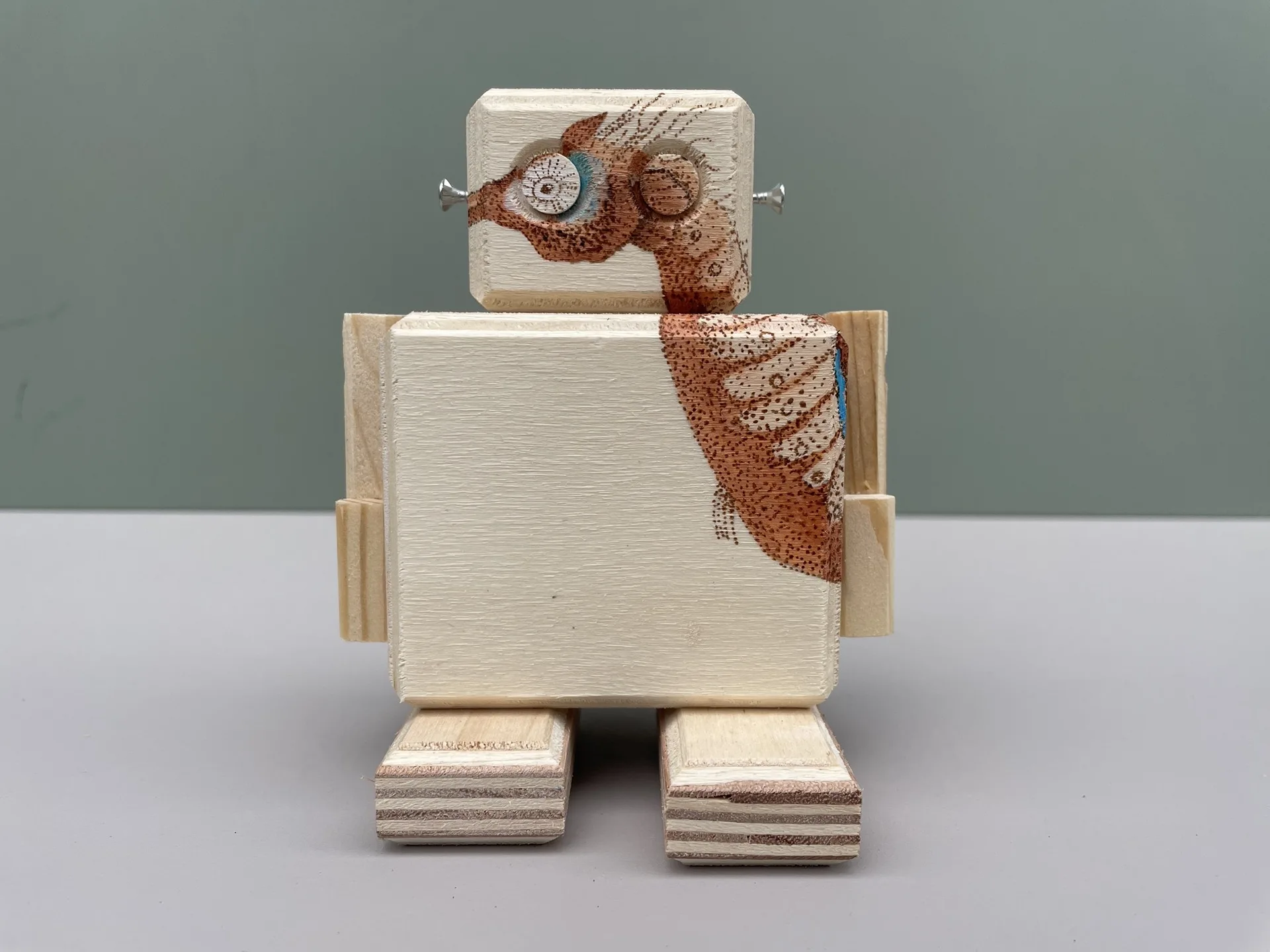 Allereerst natuurlijk onze Rijkswachters. Deze houten robotjes zijn gemaakt van de transportkisten van het Rijksmuseum. Op hun rug staat een code, en daarmee kan je opzoeken welk kunstwerk ze hebben bewaakt.