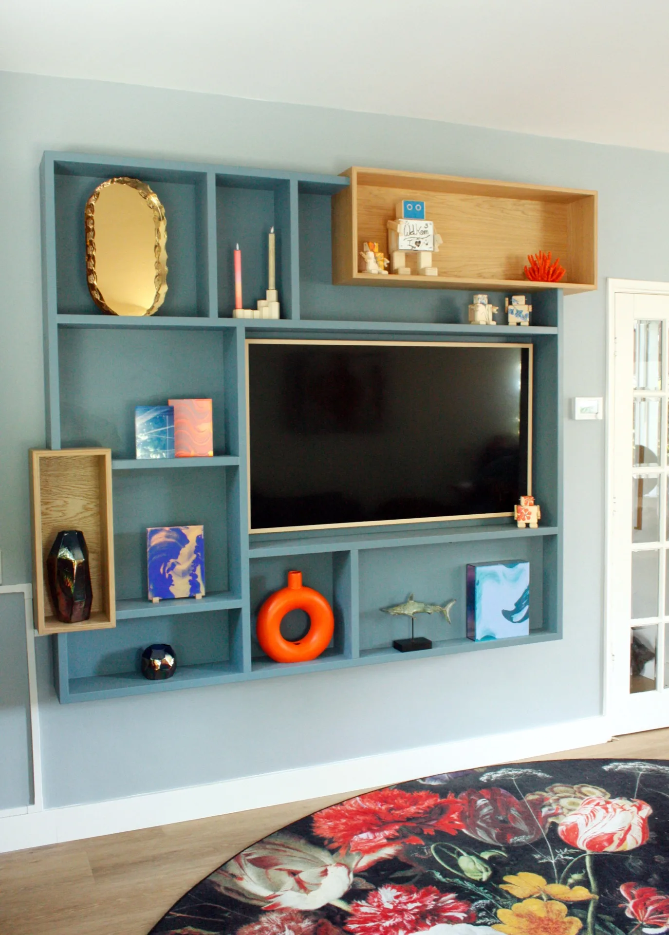 Een grote letterbak voor de tv, daar kan je veel kanten mee uit gaan. Maar omdat we om de hoek ook al een kast voor hen hebben ontworpen, wilden we daar elementen van terug laten komen in dit ontwerp.