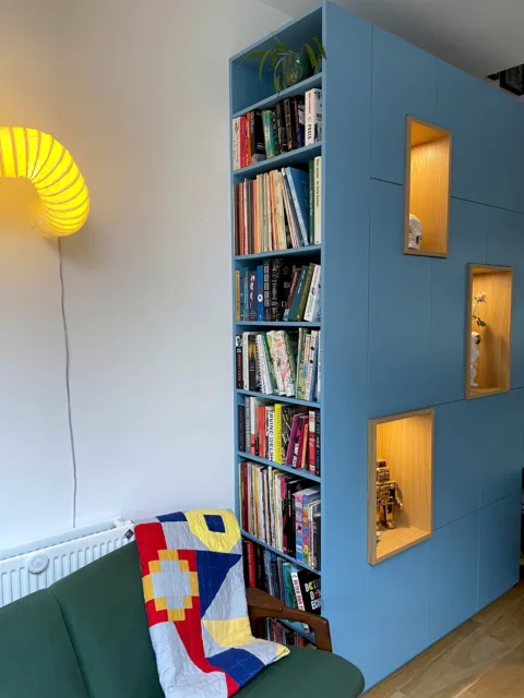 We lezen ook graag. En die willen we ook graag makkelijk pakken. Dus is de zijkant van deze kast een open boekenkast. Perfecte reikhoogte voor het bankje.