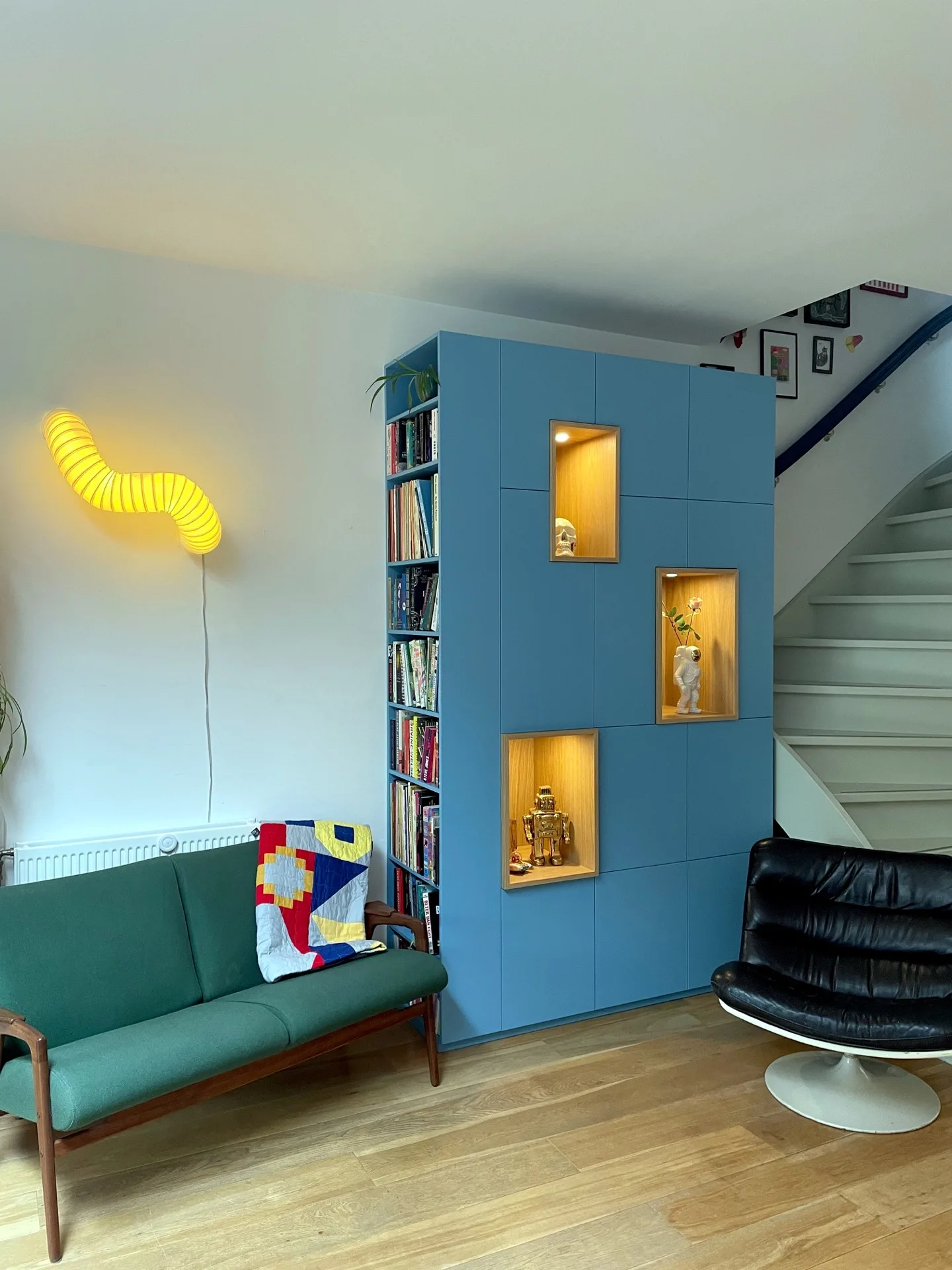 We lezen ook graag. En die willen we ook graag makkelijk pakken. Dus is de zijkant van deze kast een open boekenkast. Perfecte reikhoogte voor het bankje.