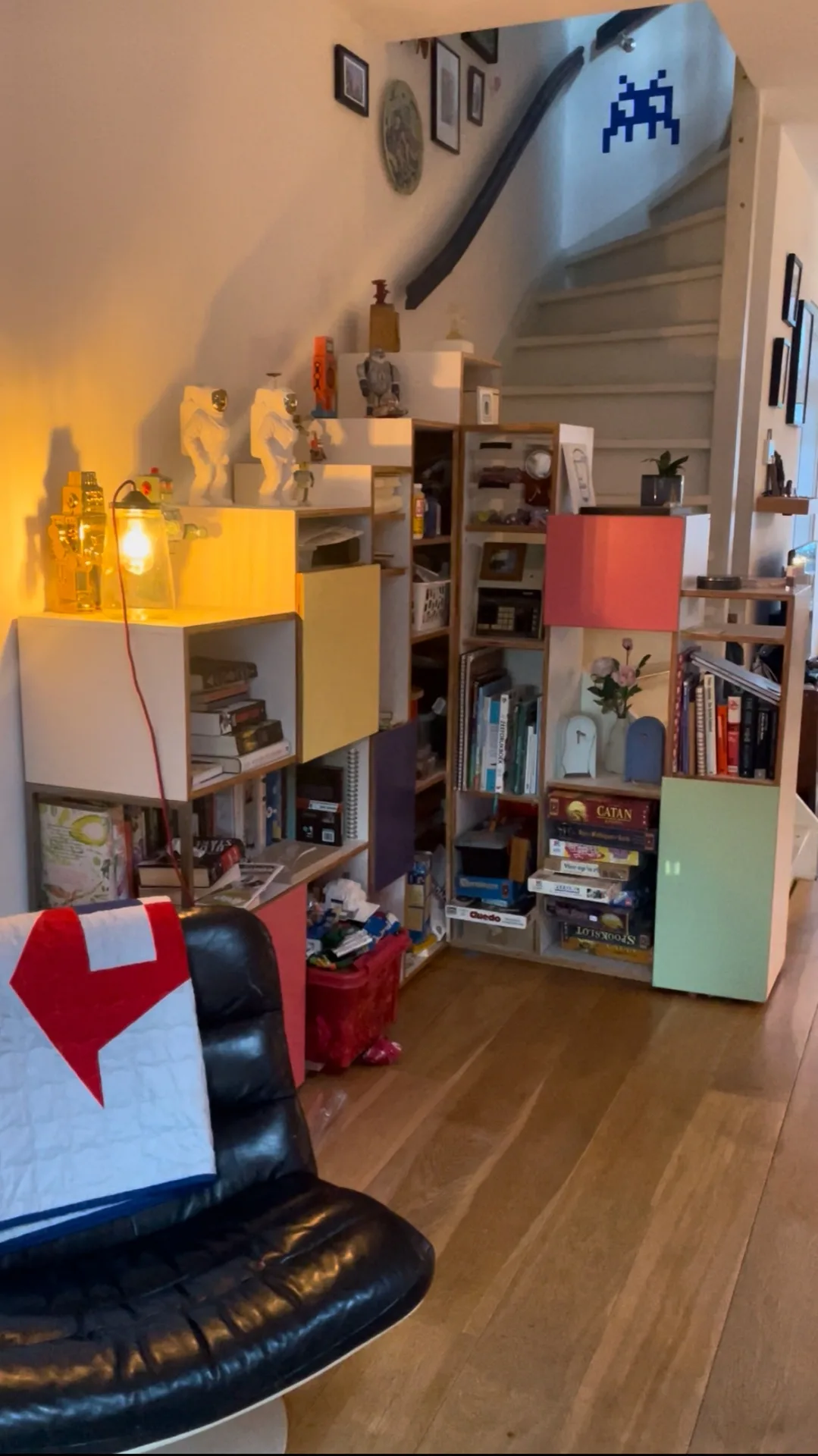 Daarboven plek voor alle spelletjes en de knutselspullen, zodat iedereen er makkelijk bij kan (opruimen blijft nog steeds een ding met pubers in huis, heel wonderlijk).