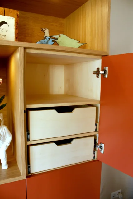 De toonvakken steken iets uit ten opzichte van de deurtjes, maar ook van elkaar. Zo is het uiterlijk van de kast speels, zonder onrustig te worden.
