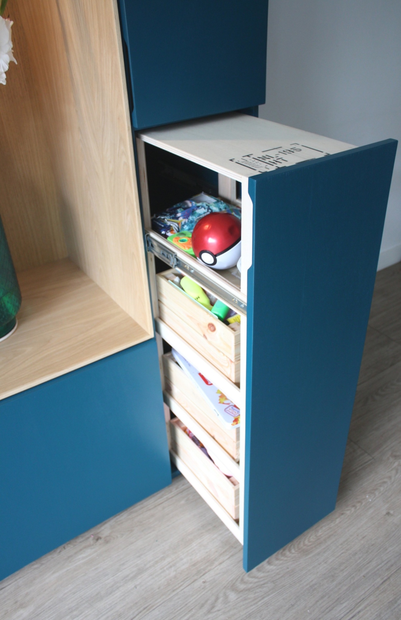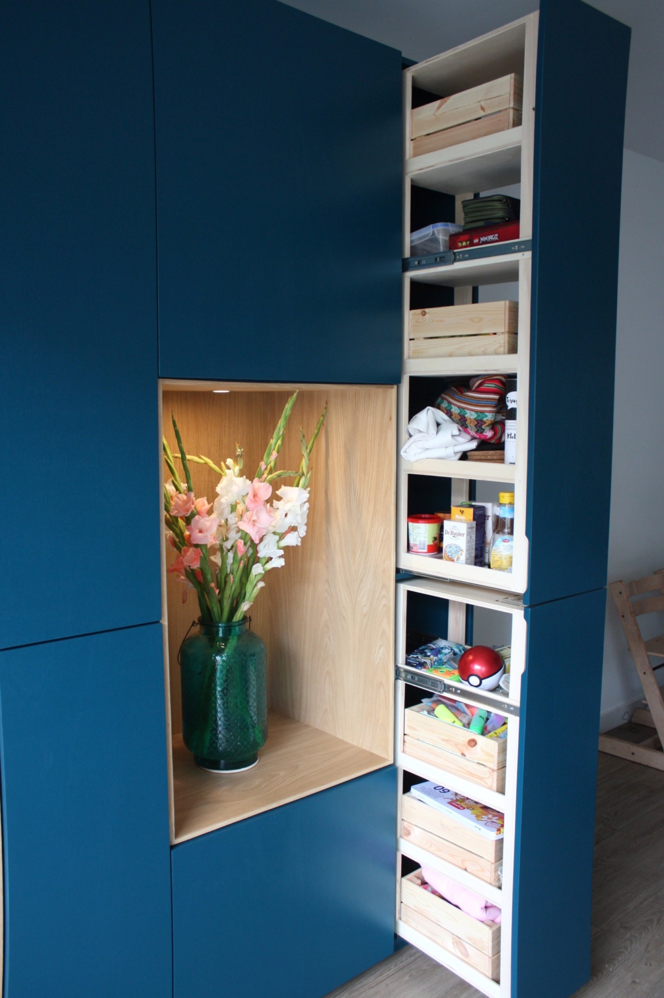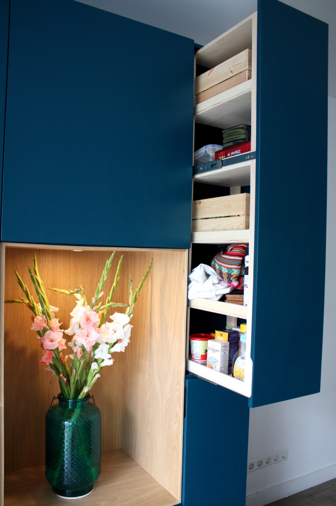De inbouwkast die we hebben gemaakt voor een gezin in Haarlem, heeft veel “features”. Zoals bijvoorbeeld een apothekerskast! Het zijn 2 gedeeltes, zodat je niet de hele hoogte in een keer uit hoeft te trekken.